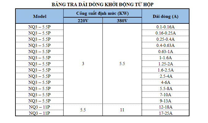 - NQ3-5.5: Dòng điện định mức 12A (AC3), công suất động cơ (khởi động & điểu khiển) ≤5.5kW (400V)